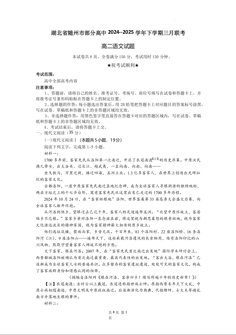 湖北省随州市区域2024-2025学年下学期3月高二月考语文