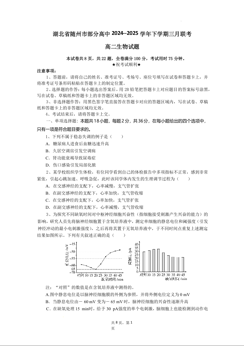 湖北省随州市区域2024-2025学年下学期3月高二月考生物