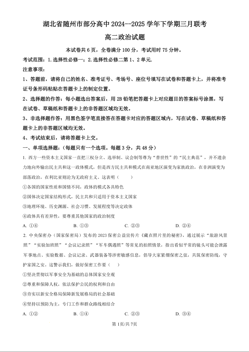 湖北省随州市区域2024-2025学年下学期3月高二月考政治(原卷版)
