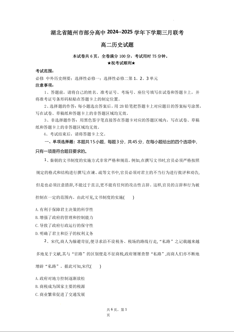 湖北省随州市区域2024-2025学年下学期3月高二月考历史