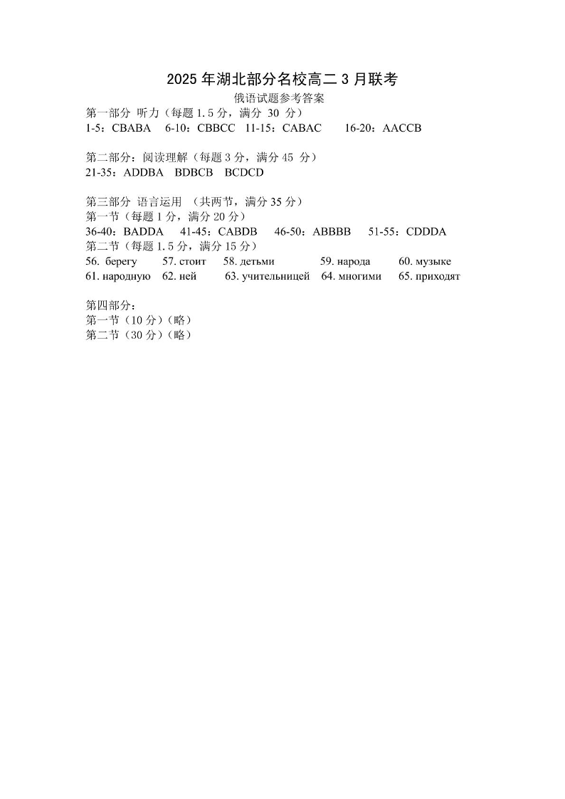 湖北省部分名校2024-2025学年下学期3月高二联考俄语答案