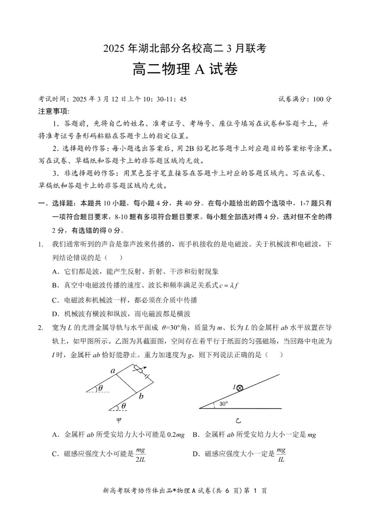 湖北省部分名校2024-2025学年下学期3月高二联考物理A