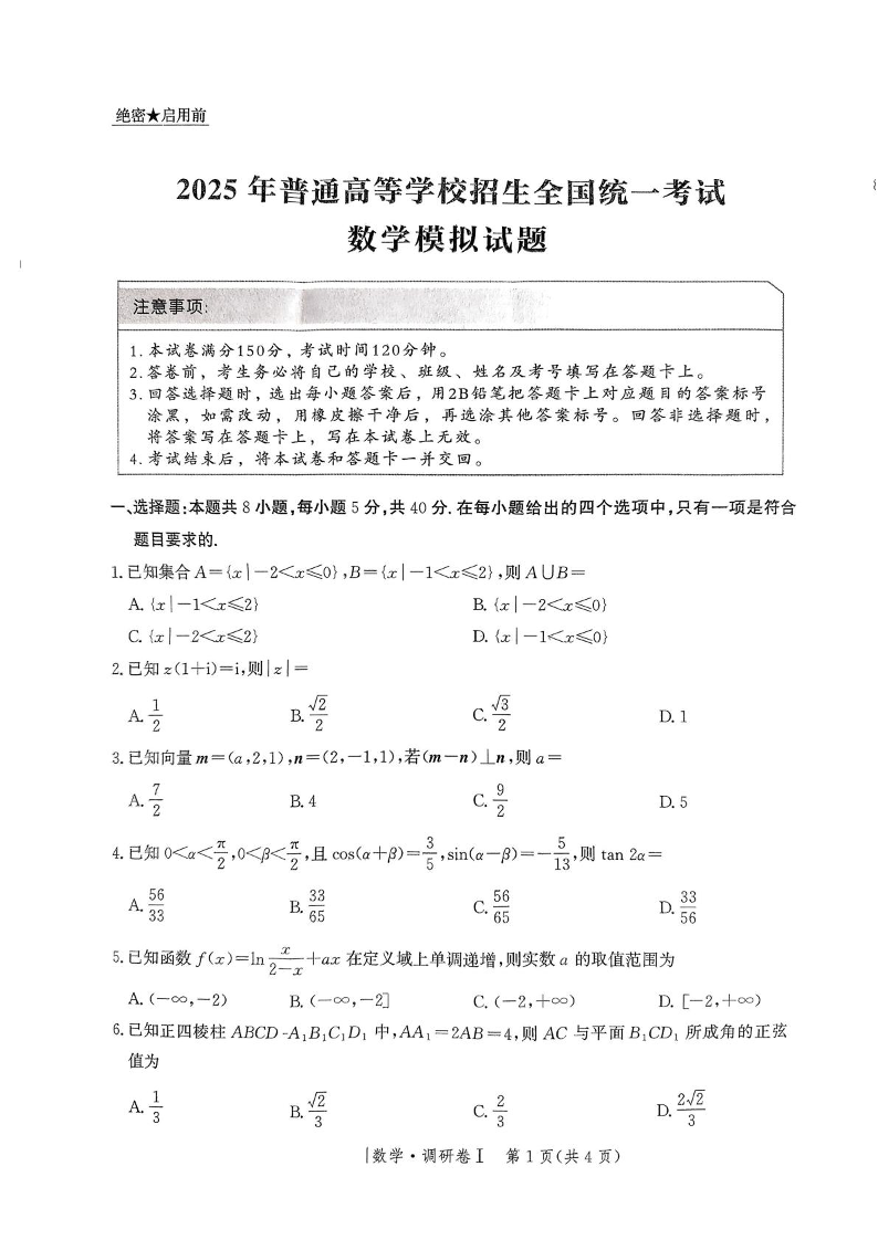 河北省2025年普通高中学业水平选择性考试·调研卷I数学+答案