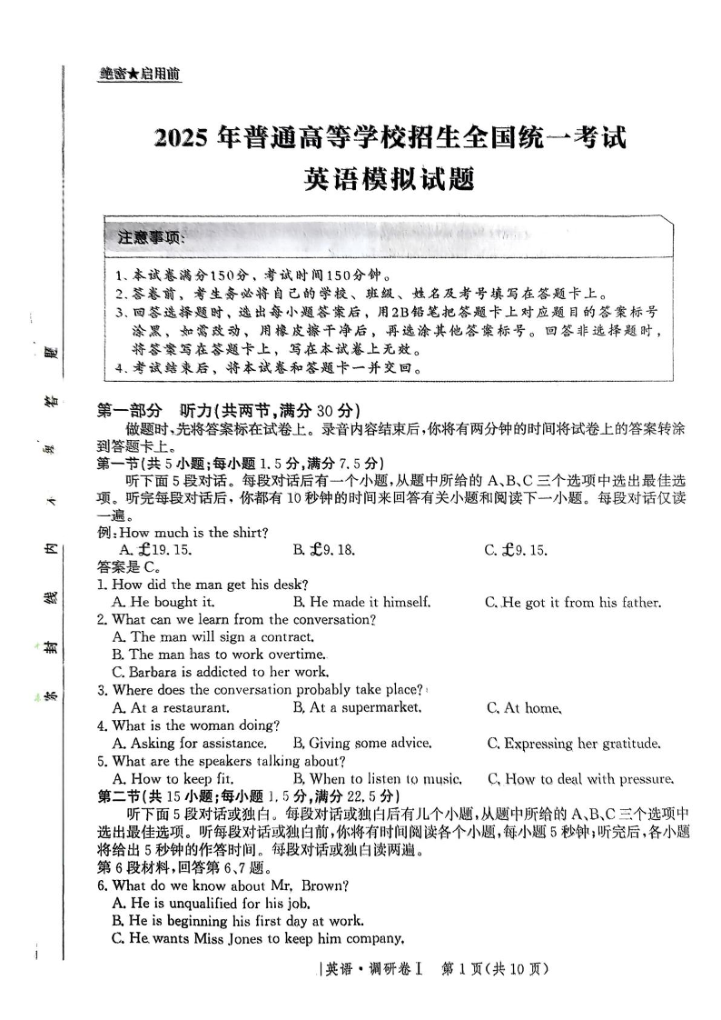 河北省2025年普通高中学业水平选择性考试·调研卷I英语+答案