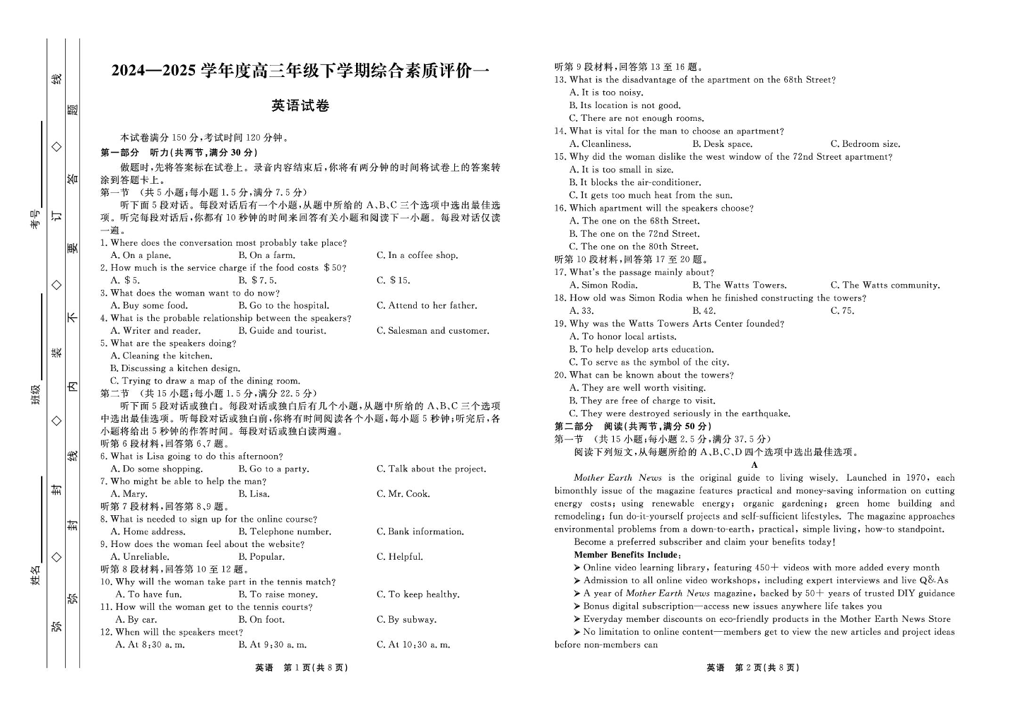 河北省衡中同卷2025届高三下学期综合素质评价(一)英语