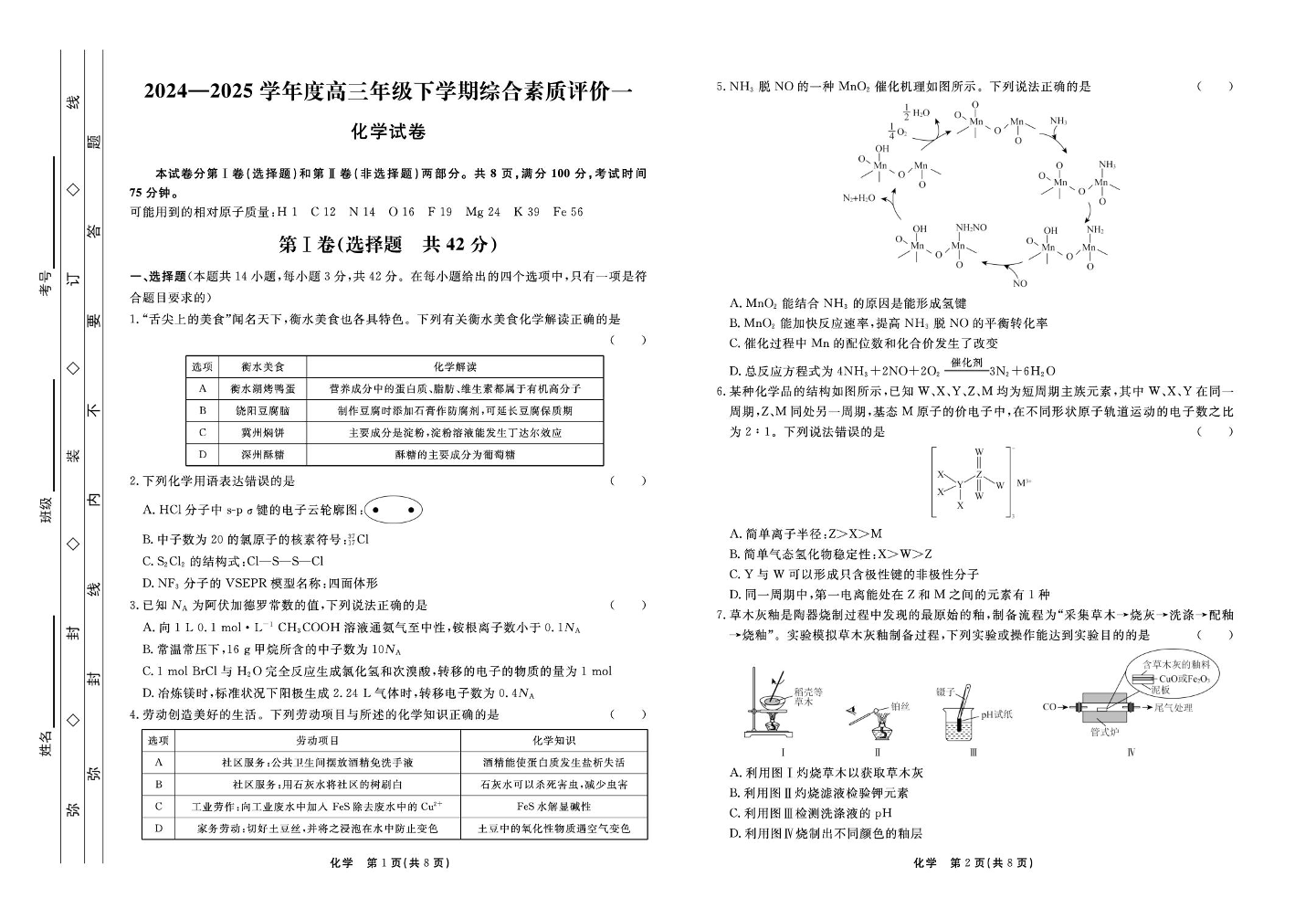河北省衡中同卷2025届高三下学期综合素质评价(一)化学