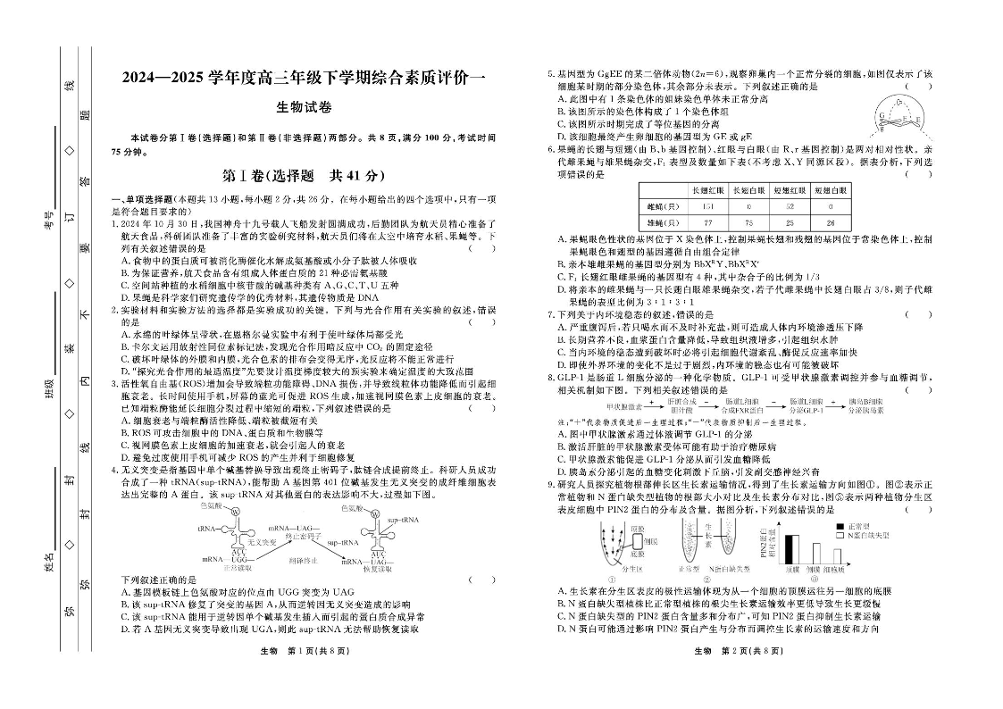 河北省衡中同卷2025届高三下学期综合素质评价(一)生物+答案