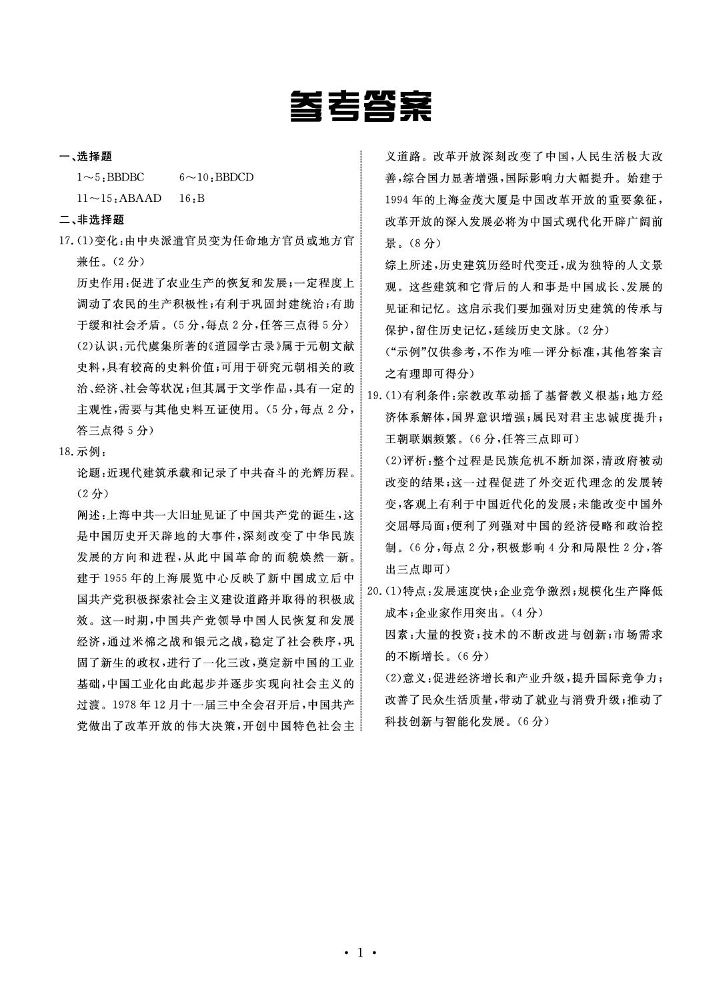 河北省衡中同卷2025届高三下学期综合素质评价(一)历史答案
