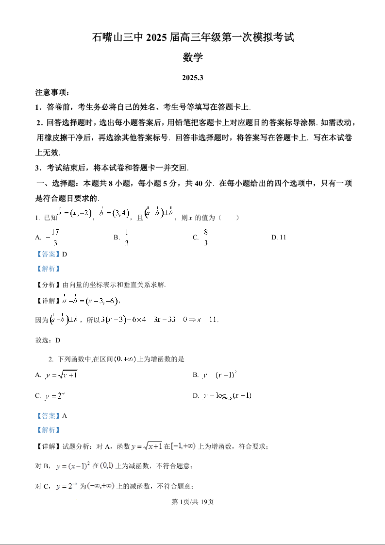 宁夏石嘴山市第三中学2025届高三下学期第一次模拟考试数学(精品解析版)