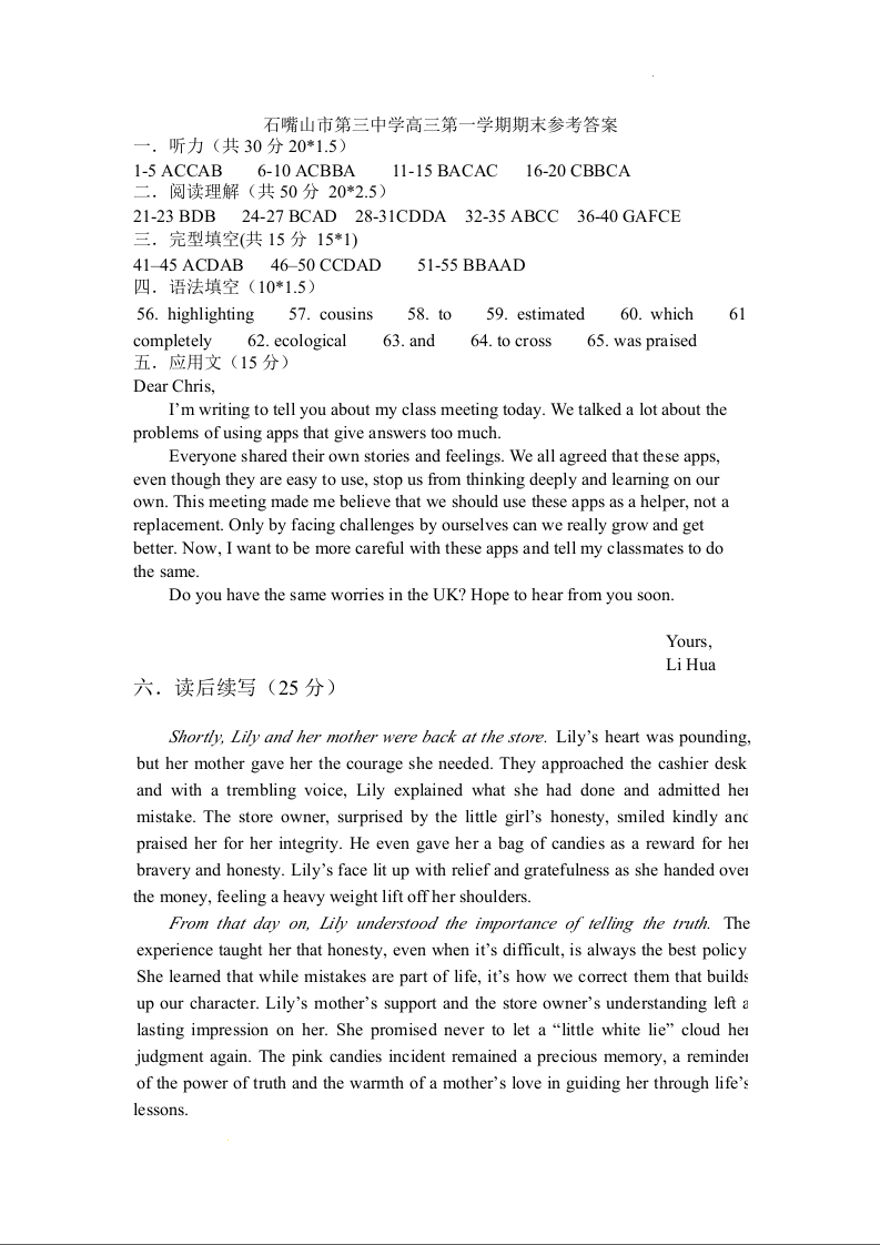 宁夏石嘴山市第三中学2025届高三下学期第一次模拟考试英语答案