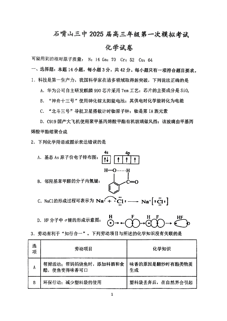 宁夏石嘴山市第三中学2025届高三下学期第一次模拟考试化学