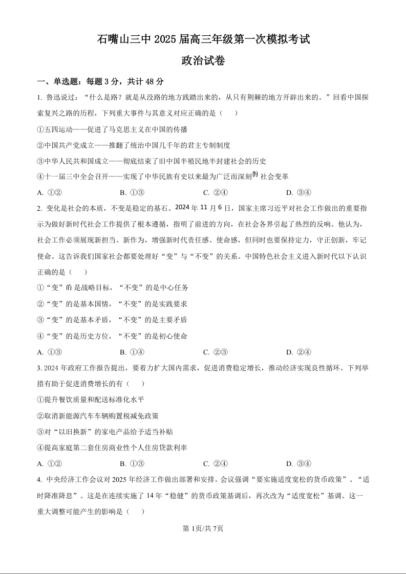 宁夏石嘴山市第三中学2025届高三下学期第一次模拟考试政治(原卷版)