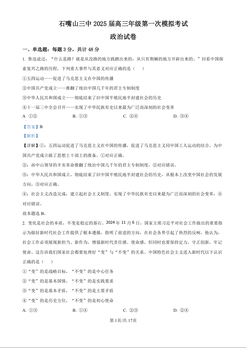 宁夏石嘴山市第三中学2025届高三下学期第一次模拟考试政治(精品解析版)