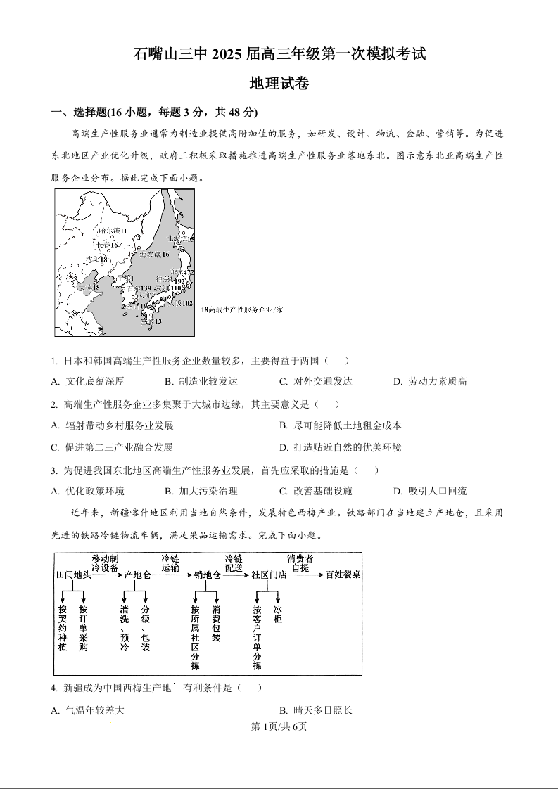 宁夏石嘴山市第三中学2025届高三下学期第一次模拟考试地理(原卷版)
