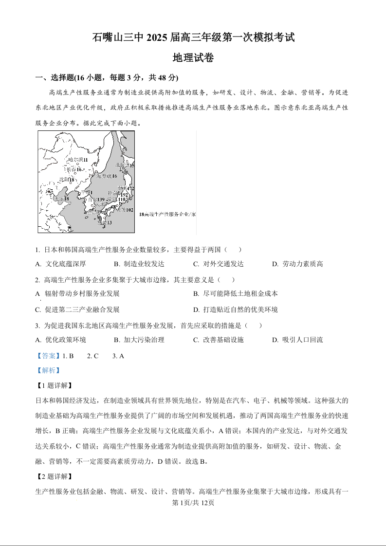 宁夏石嘴山市第三中学2025届高三下学期第一次模拟考试地理(精品解析版)