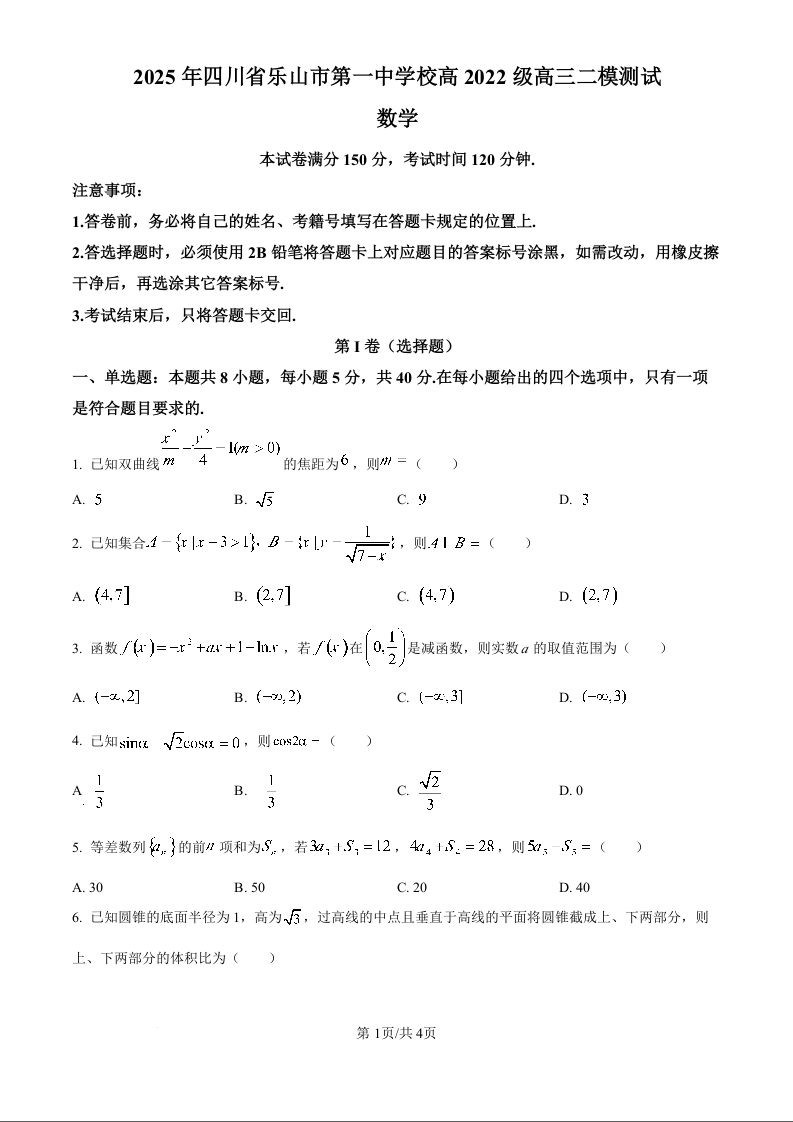 四川省乐山市第一中学校高2022级高三二模测试数学