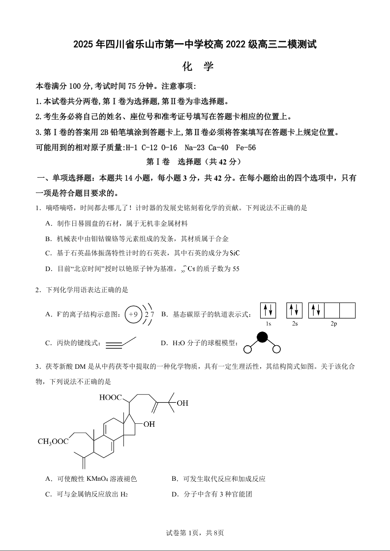 四川省乐山市第一中学校高2022级高三二模测试化学+答案