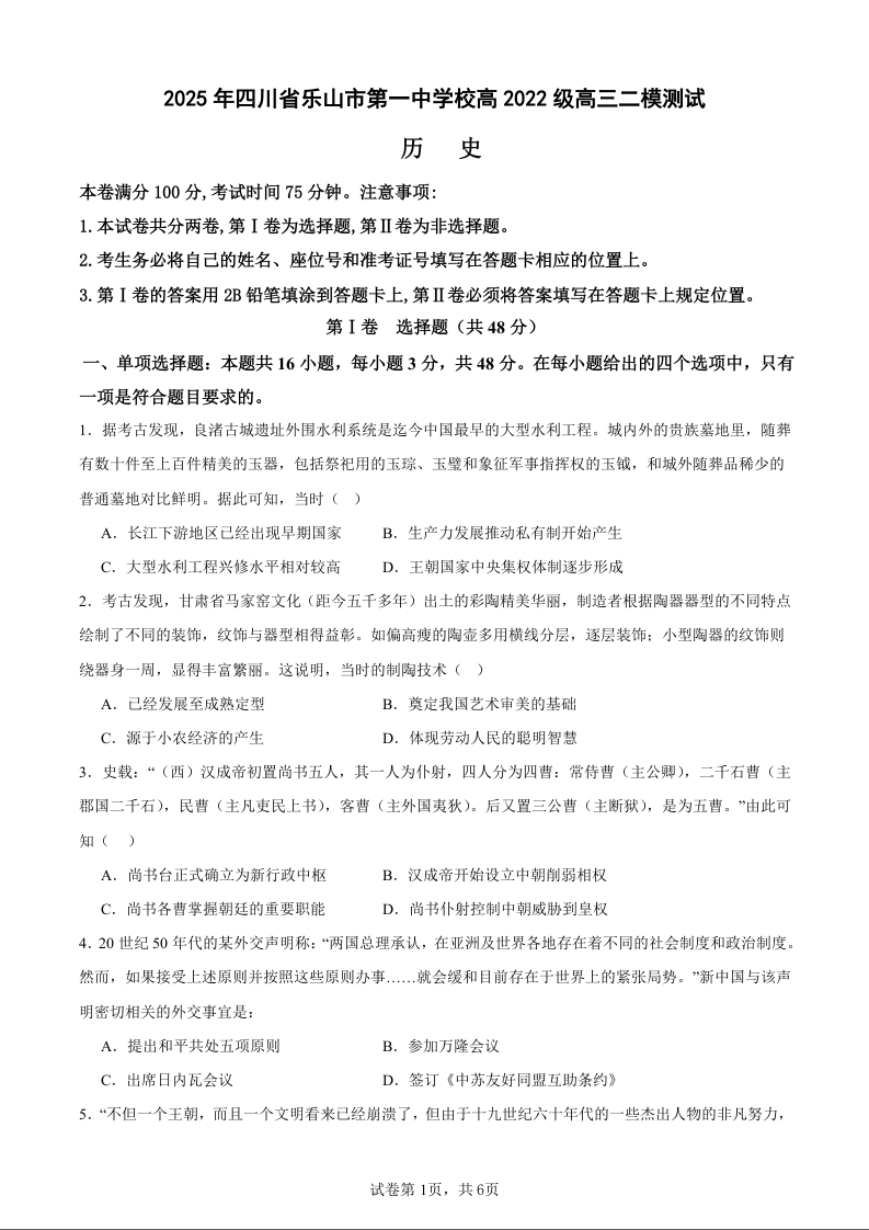 四川省乐山市第一中学校高2022级高三二模测试历史+答案