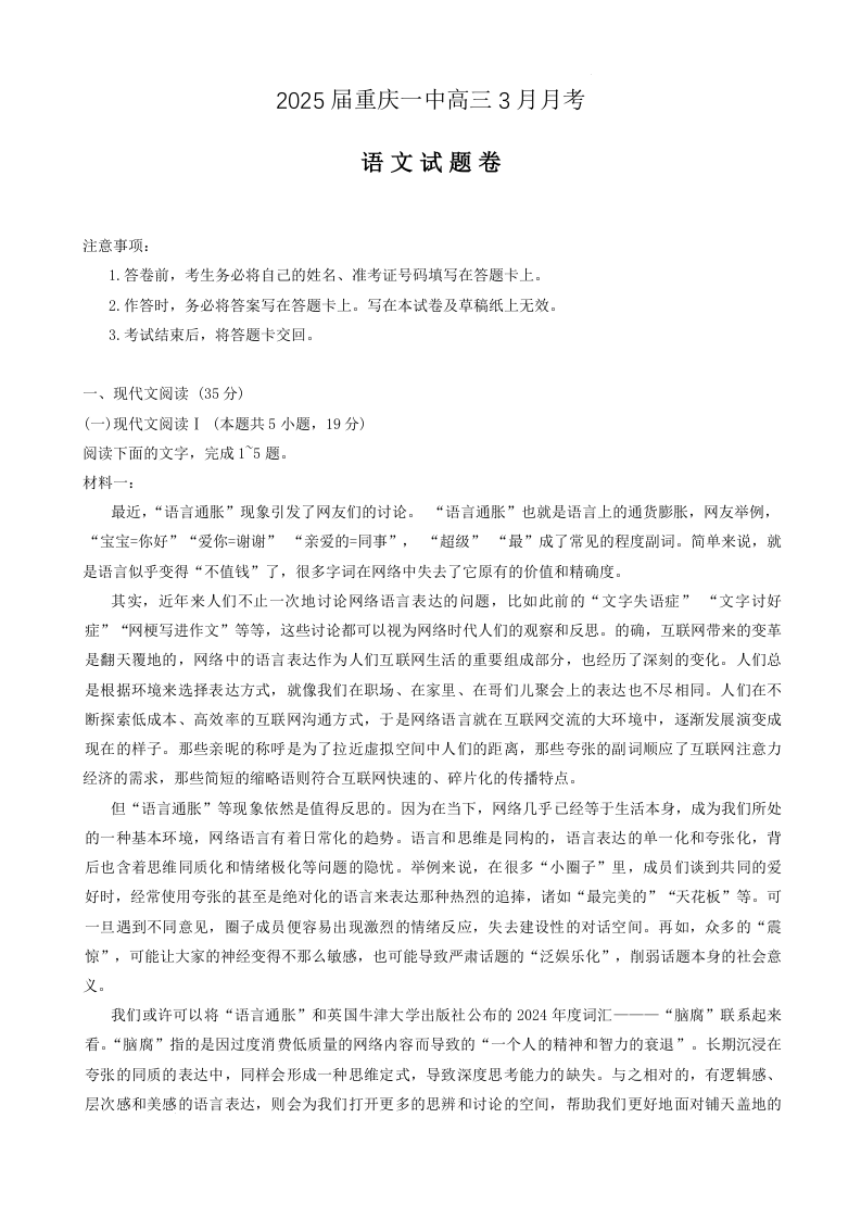 重庆市第一中学校2025届高三下学期3月适应性月考语文