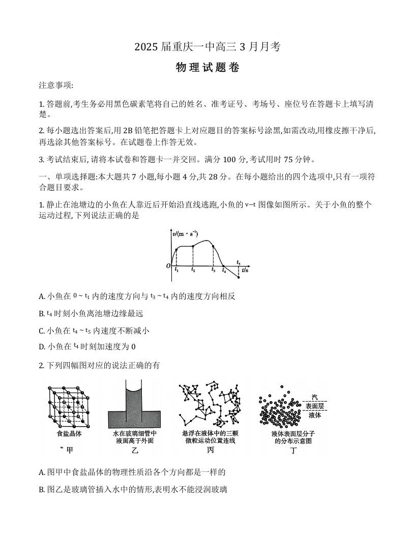 重庆市第一中学校2025届高三下学期3月适应性月考物理