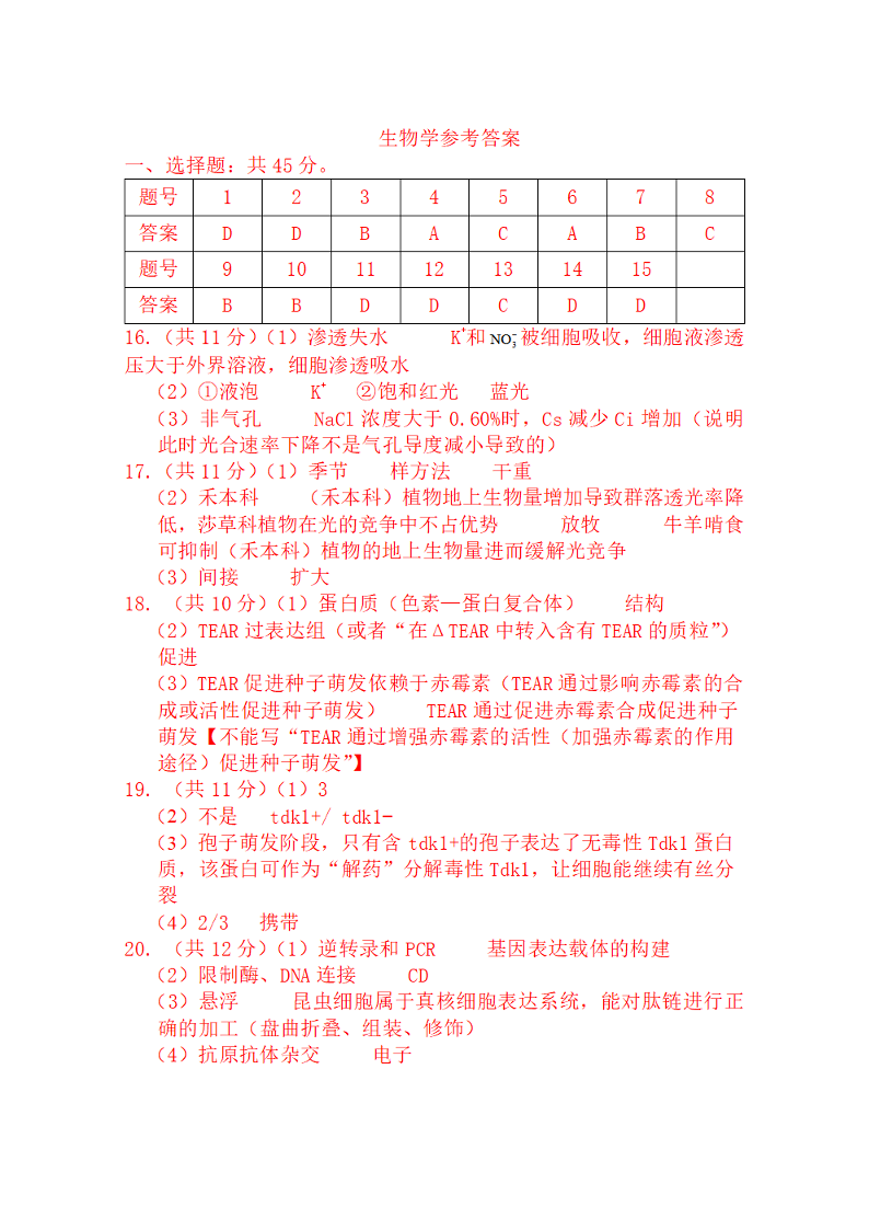 重庆市第一中学校2025届高三下学期3月适应性月考生物答案
