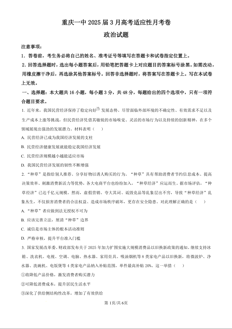 重庆市第一中学校2025届高三下学期3月适应性月考政治(原卷版)