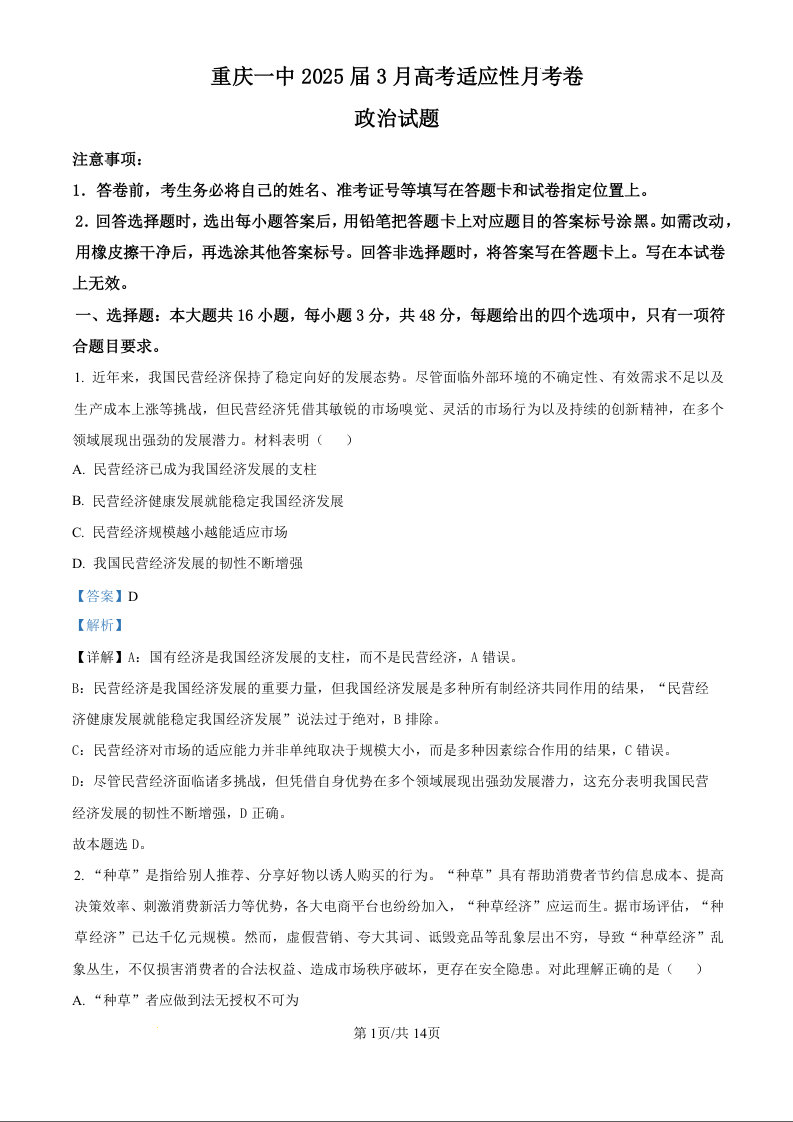 重庆市第一中学校2025届高三下学期3月适应性月考政治(解析版)