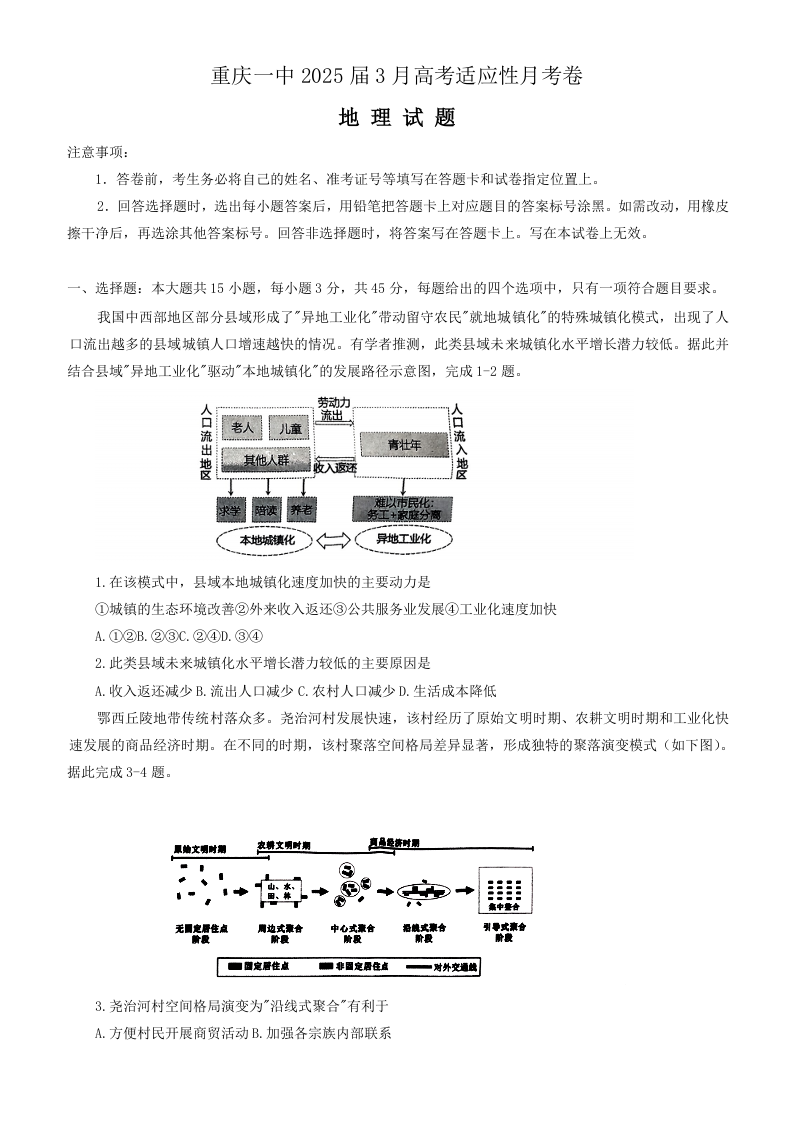 重庆市第一中学校2025届高三下学期3月适应性月考地理+答案