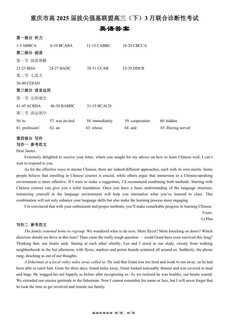 重庆市高2025届(育才中学、西南大学附中、鲁能巴蜀)拔尖强基联盟高三(下)3月联合诊断性考试英语答案