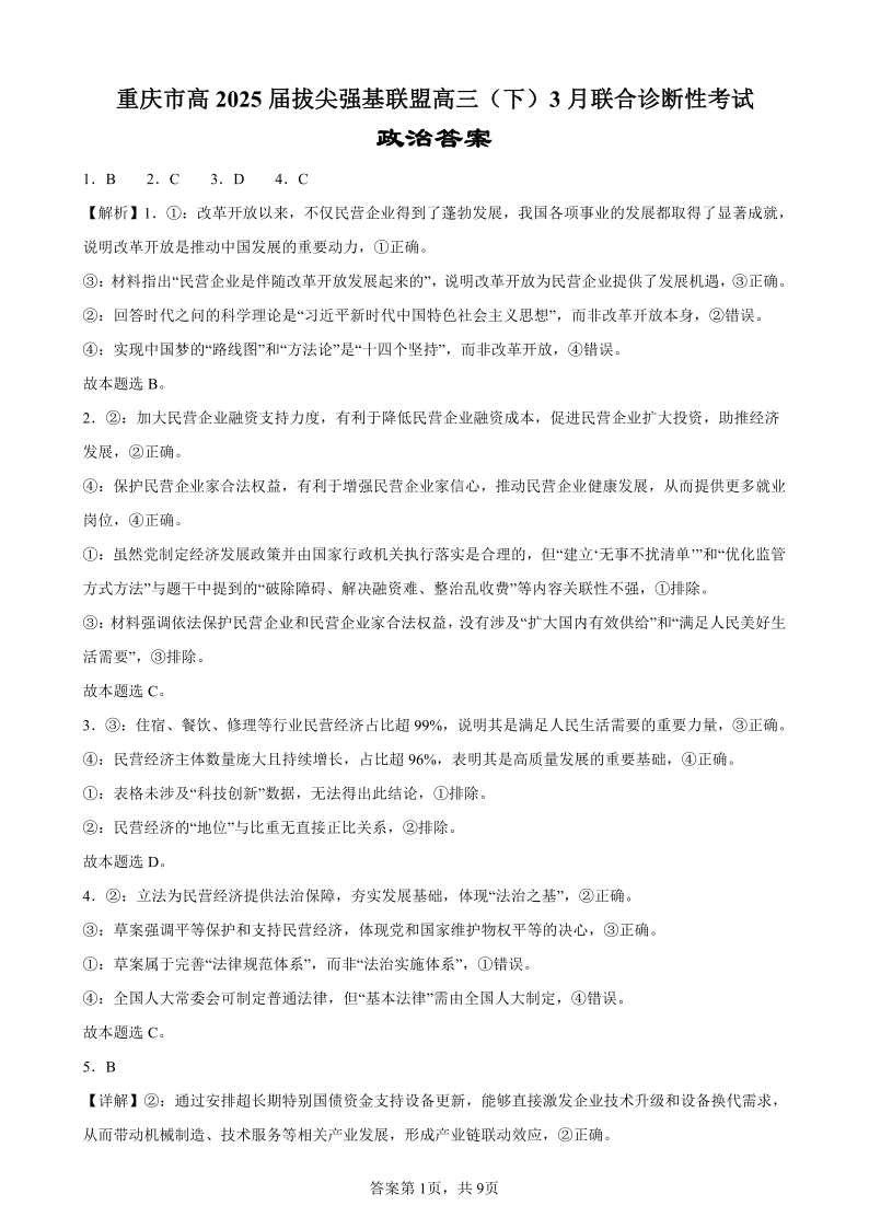 重庆市高2025届(育才中学、西南大学附中、鲁能巴蜀)拔尖强基联盟高三(下)3月联合诊断性考试政治答案