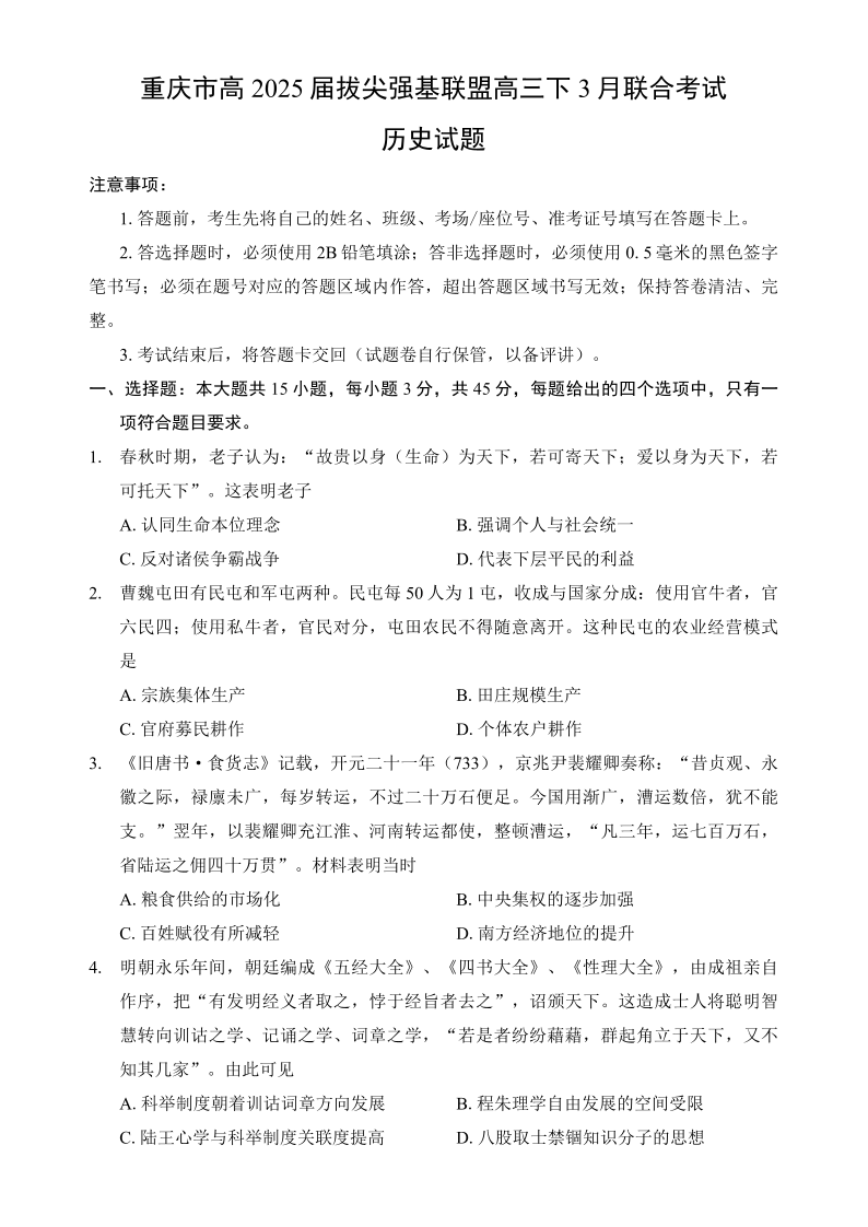 重庆市高2025届(育才中学、西南大学附中、鲁能巴蜀)拔尖强基联盟高三(下)3月联合诊断性考试历史