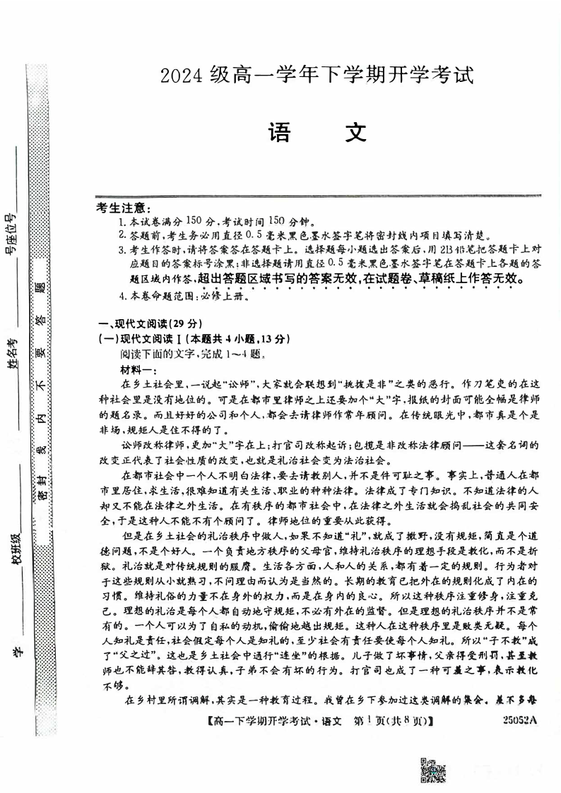安徽省部分地市2024-2025学年下学期高一开学考试语文