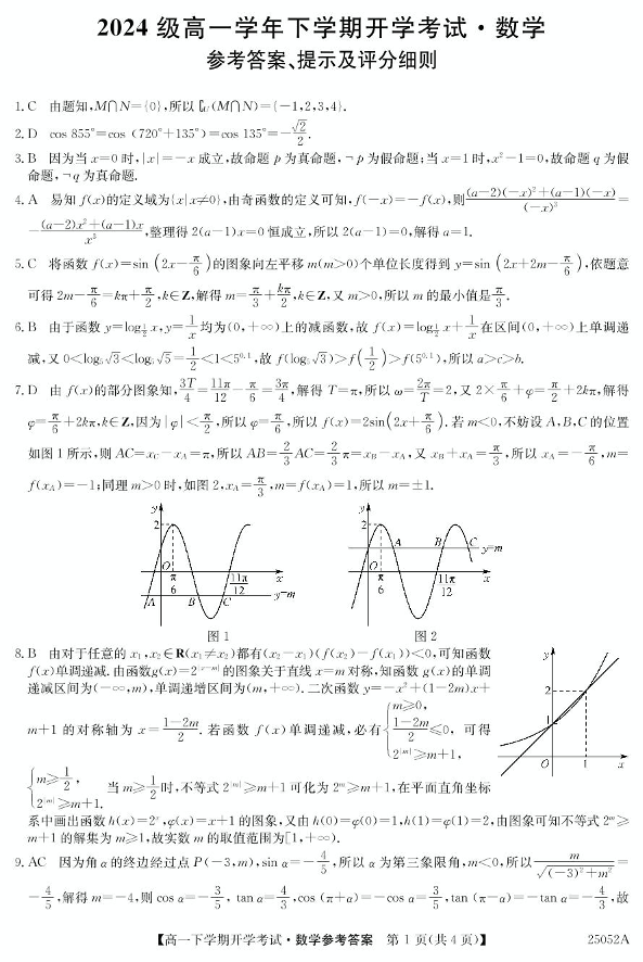 安徽省部分地市2024-2025学年下学期高一开学考试数学答案