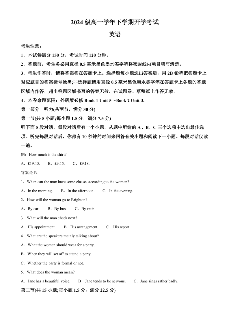 安徽省部分地市2024-2025学年下学期高一开学考试英语+答案