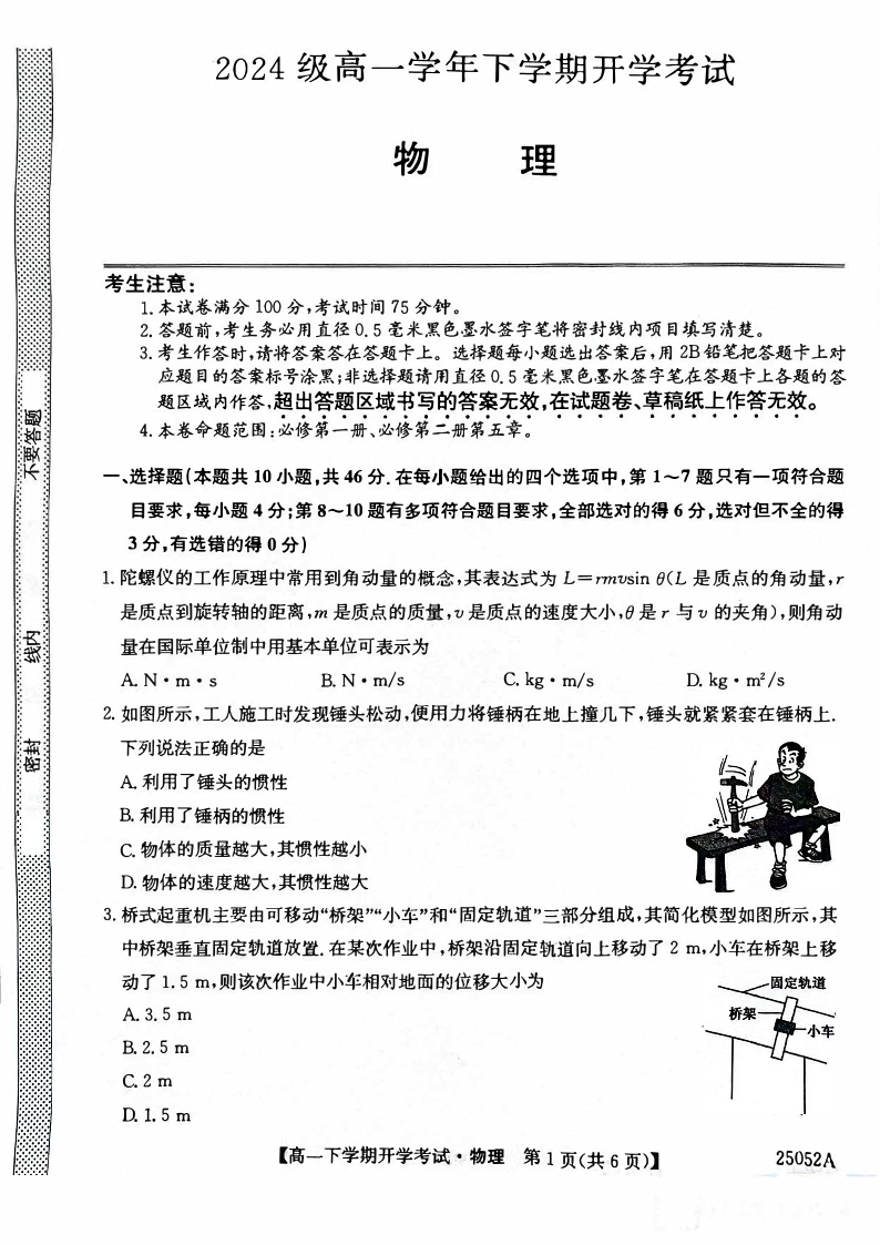 安徽省部分地市2024-2025学年下学期高一开学考试物理