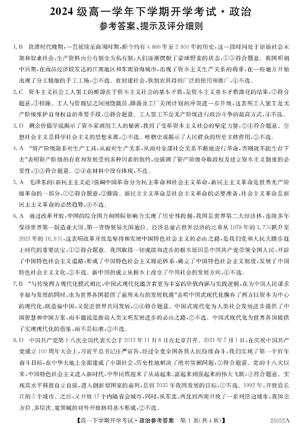 安徽省部分地市2024-2025学年下学期高一开学考试政治答案