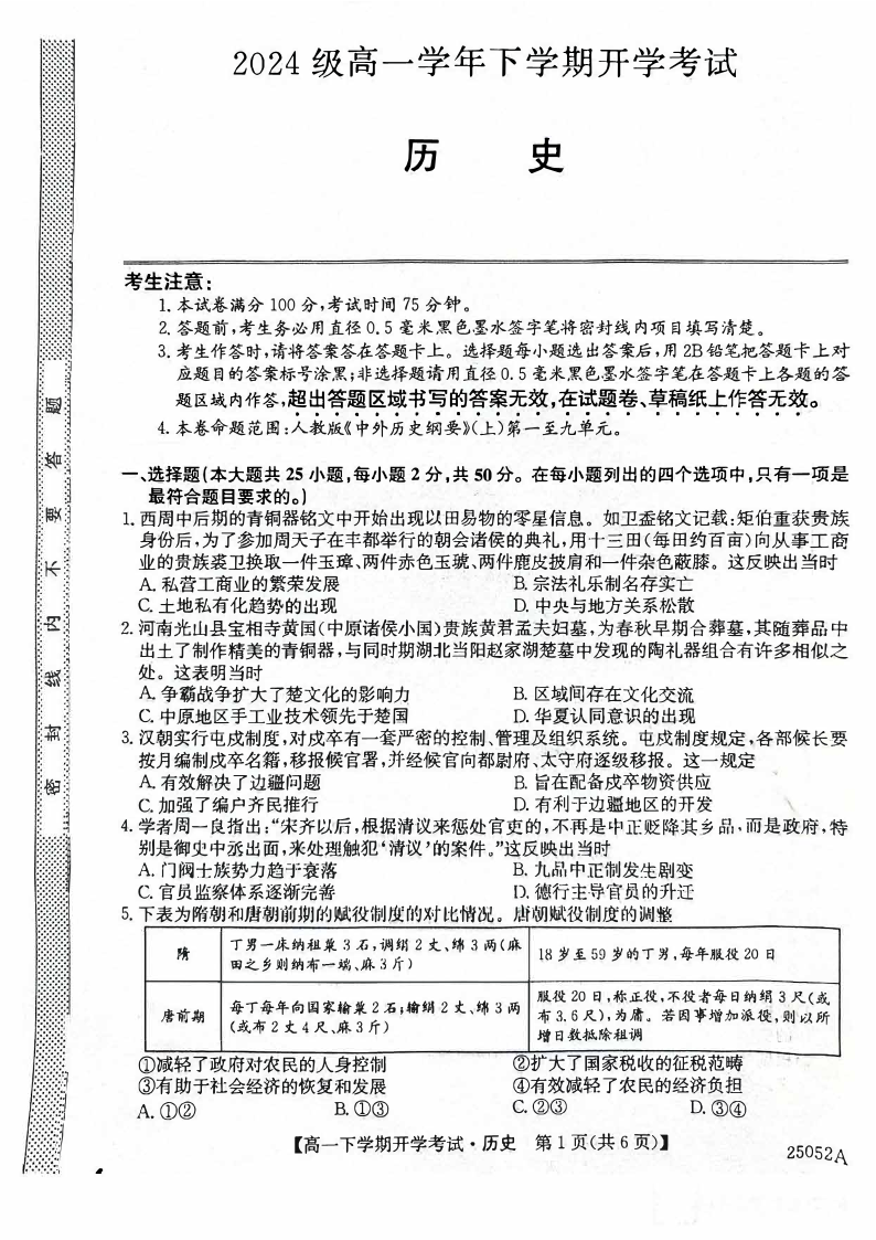 安徽省部分地市2024-2025学年下学期高一开学考试历史