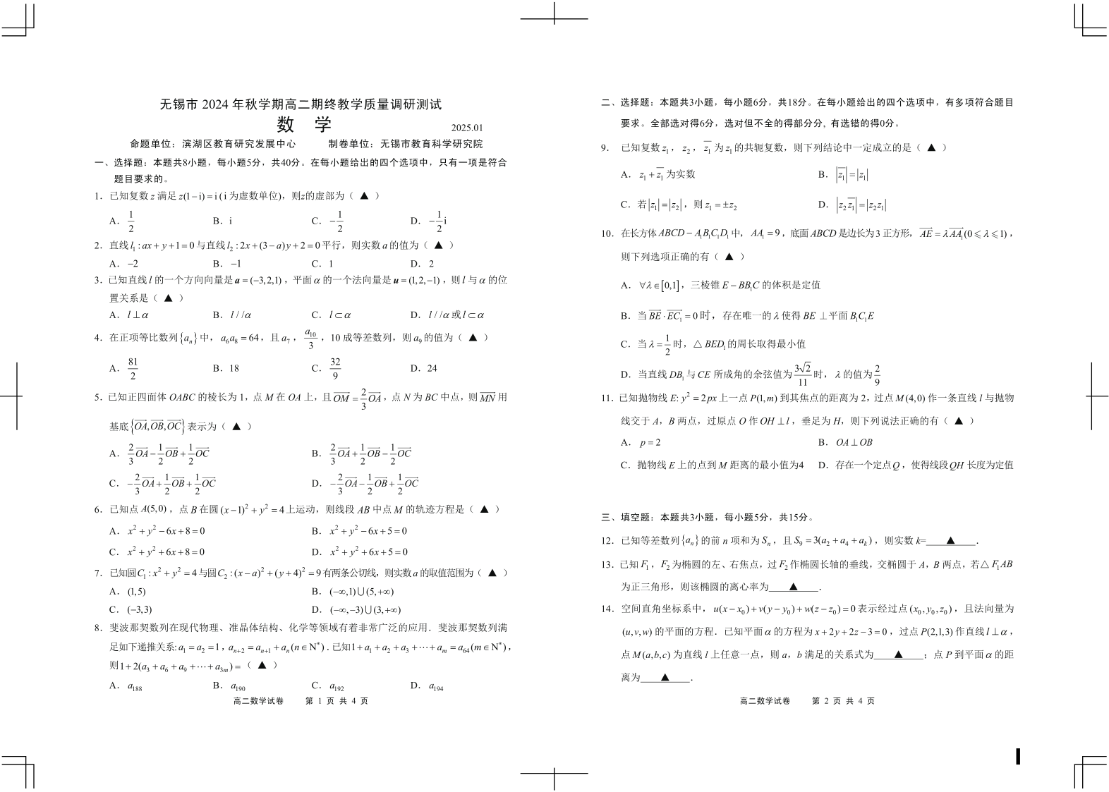 江苏省无锡市2024-2025学年上学期1月高二期末考试数学