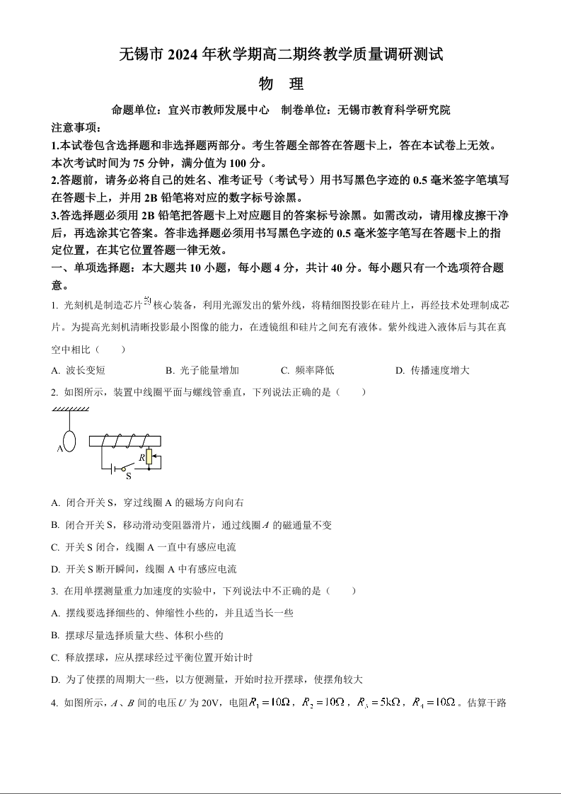 江苏省无锡市2024-2025学年上学期1月高二期末考试物理(原卷版)