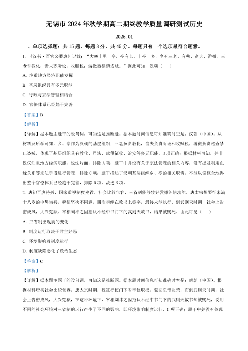 江苏省无锡市2024-2025学年上学期1月高二期末考试历史(解析版)