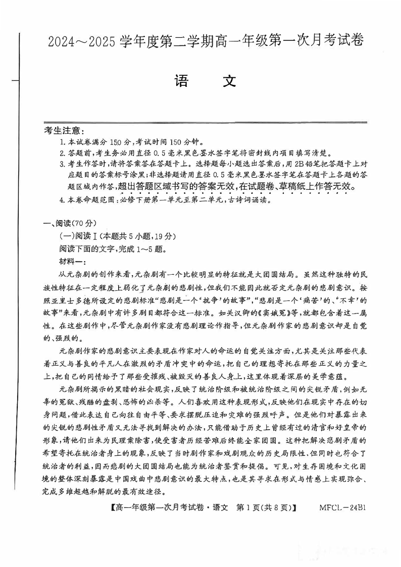 河北省沧州市四县2024-2025学年下学期3月高一月考语文