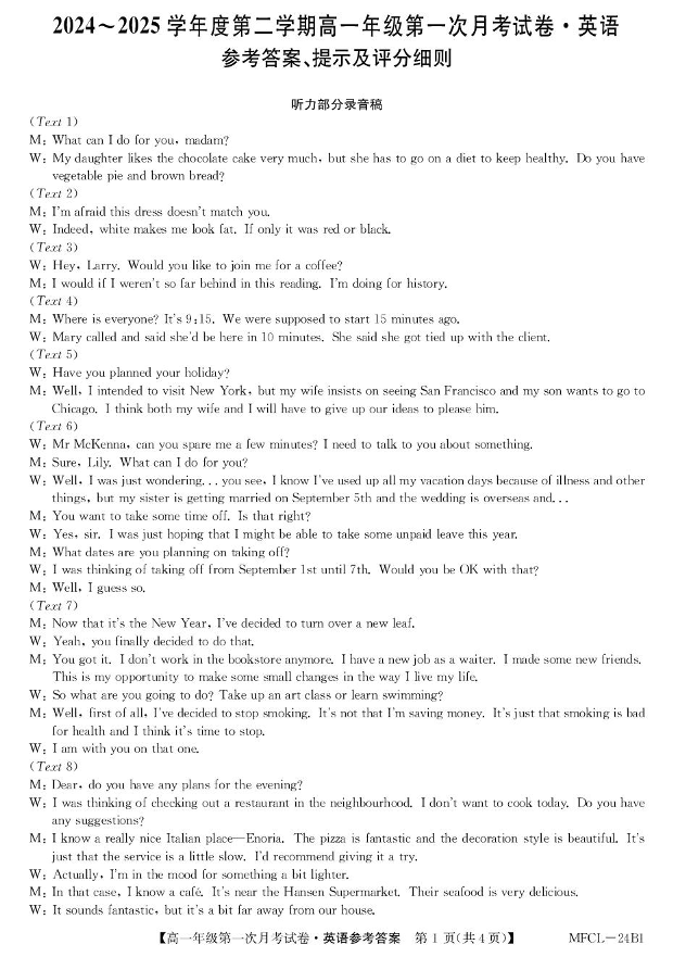 河北省沧州市四县2024-2025学年下学期3月高一月考英语答案