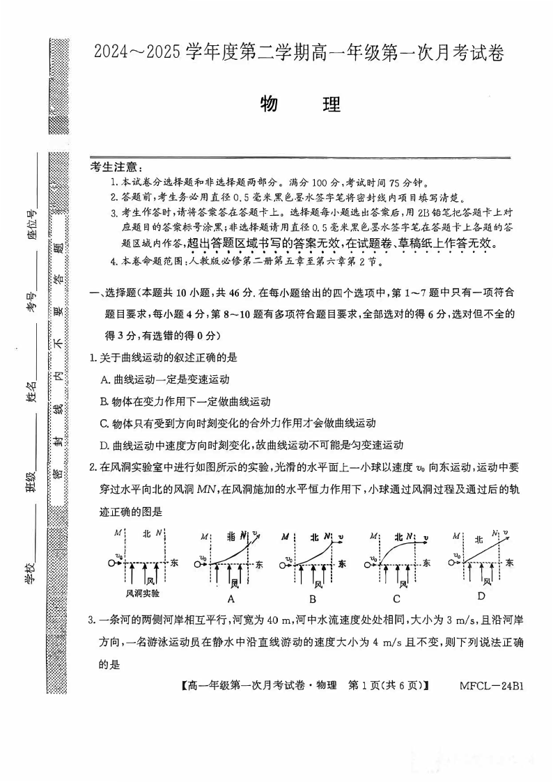 河北省沧州市四县2024-2025学年下学期3月高一月考物理