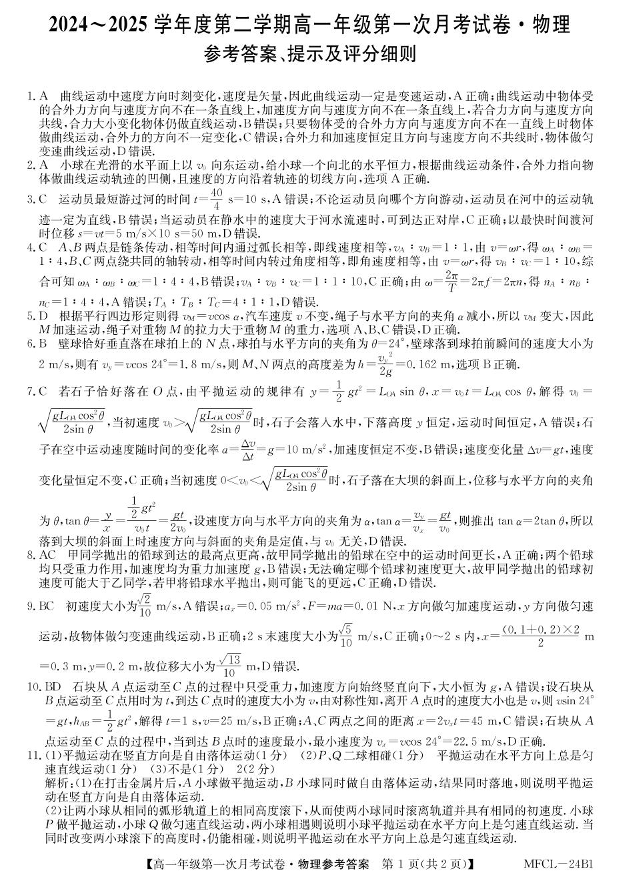 河北省沧州市四县2024-2025学年下学期3月高一月考物理答案