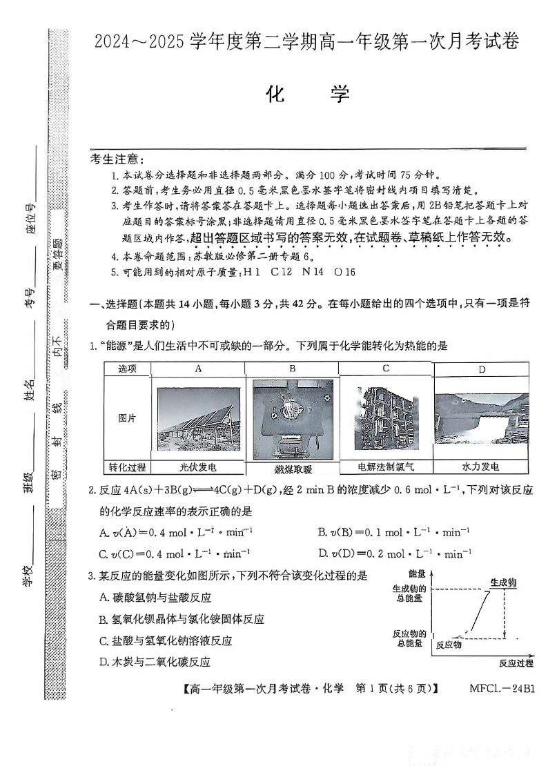 河北省沧州市四县2024-2025学年下学期3月高一月考化学