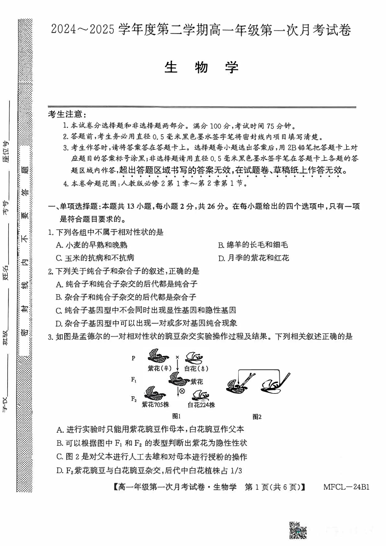 河北省沧州市四县2024-2025学年下学期3月高一月考生物