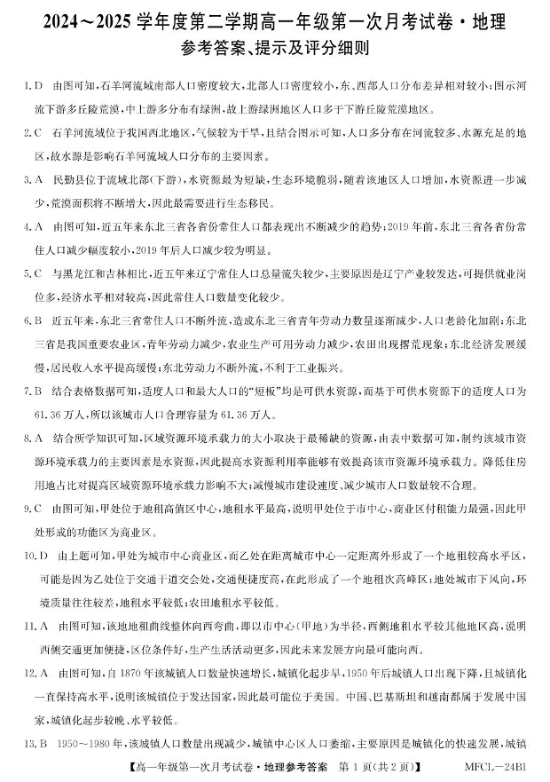 河北省沧州市四县2024-2025学年下学期3月高一月考地理答案