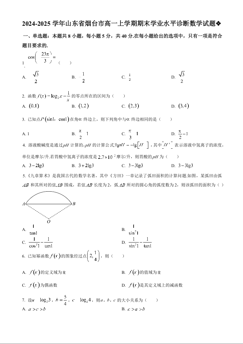 山东省烟台市2024-2025学年上学期1月高一期末考试数学(原卷版)