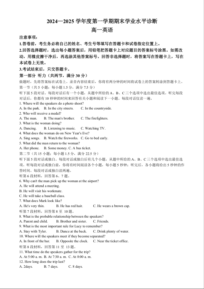 山东省烟台市2024-2025学年上学期1月高一期末考试英语+答案