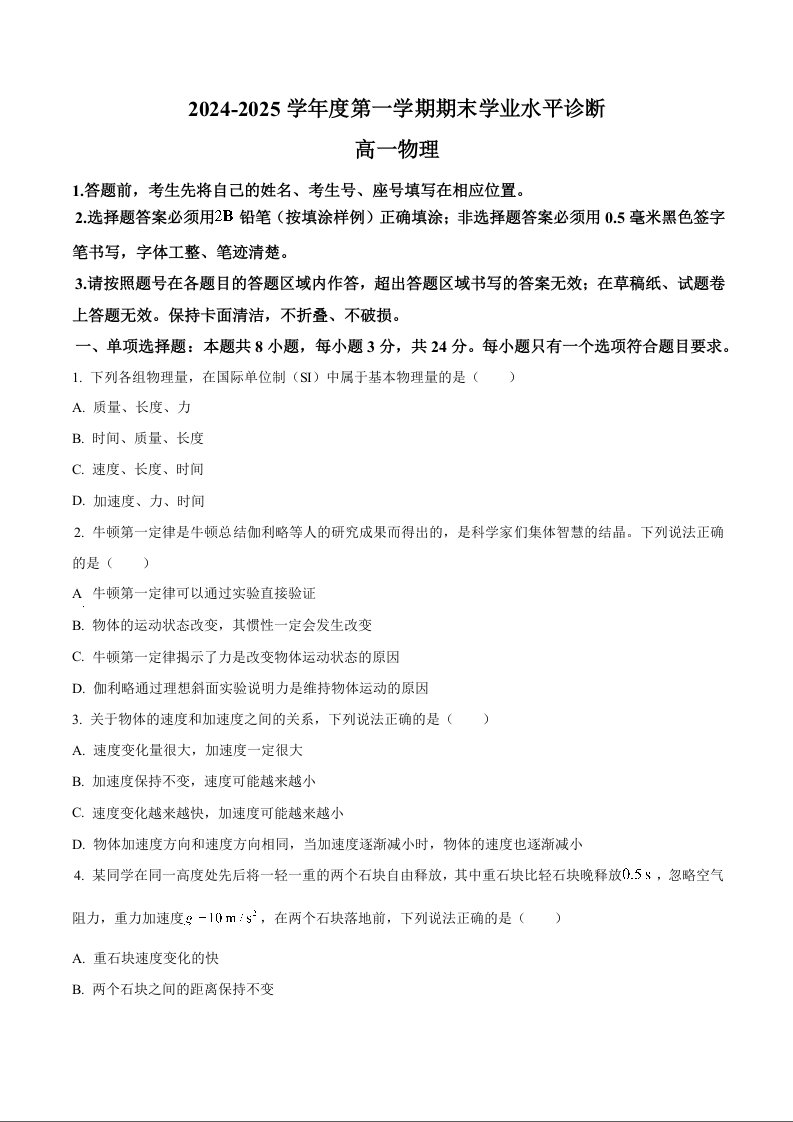 山东省烟台市2024-2025学年上学期1月高一期末考试物理(原卷版)